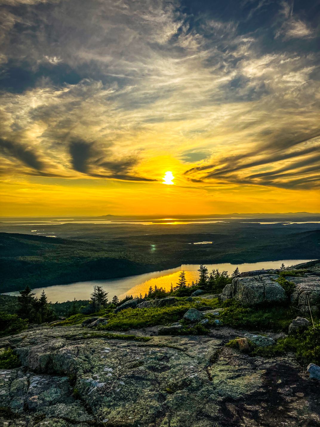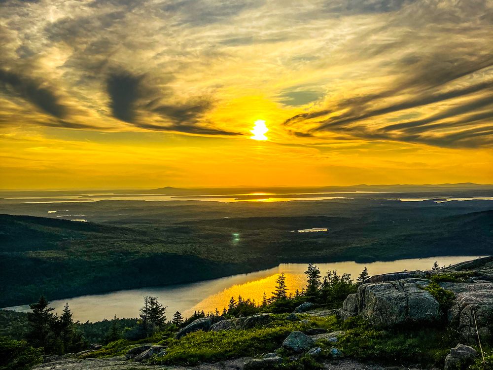 From the summit of Cadillac Mountain in Acadia National Park, the setting sun spread its light like wings across the sky — illuminating the harmony of mountains, forests, lakes, and sea that shape the park’s beauty, and leaving behind a golden stillness.