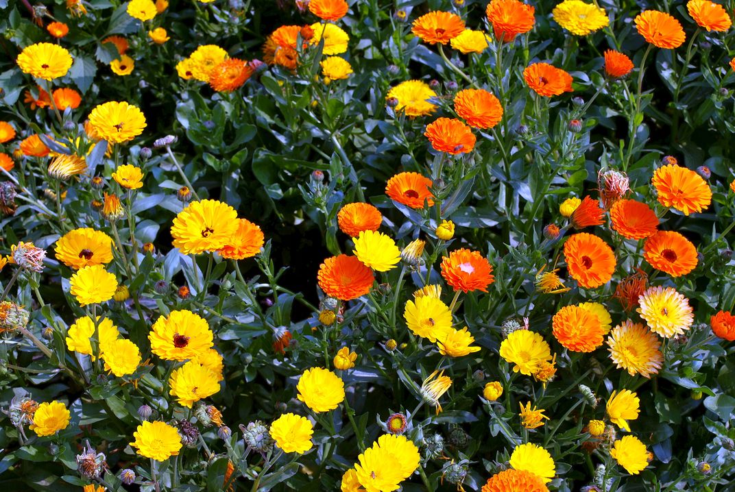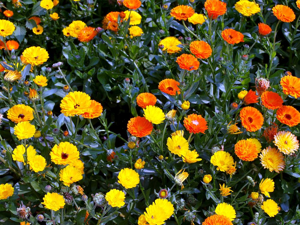 The photograph shows a collection of flowers of various colours