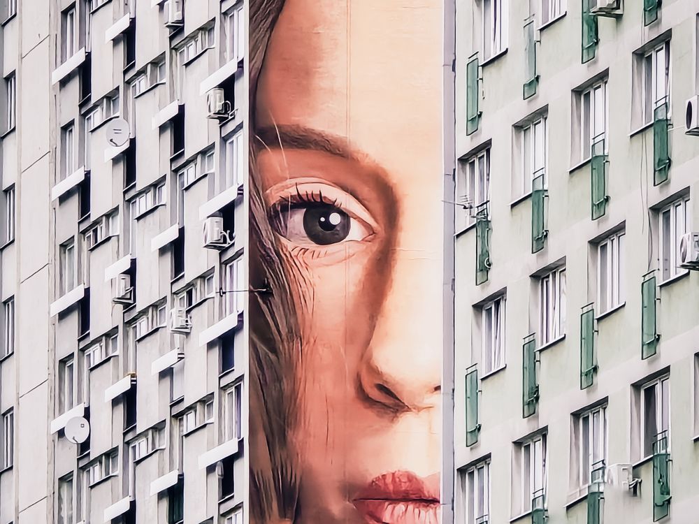 A giant painted face emerges between two Warsaw apartment blocks, as if a hidden observer watches city life from a silent slit in the skyline. More than a mural, she becomes a mysterious presence, a human story woven into concrete, windows, and everyday routines.