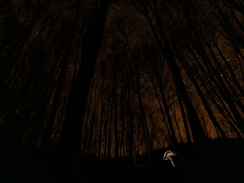 The photo captures a European badger under a starry sky, just as it emerges from its den and sniffs the air, ready to embark on its nightly foraging journey.