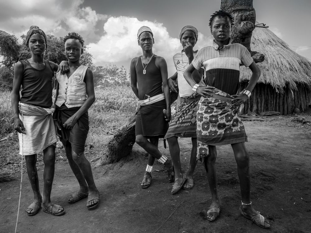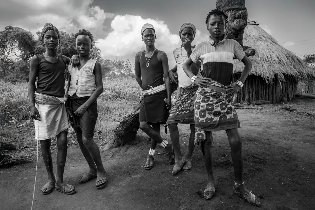 A group of Hamar boys pose confidently near their village. Their expressions hold both youthful playfulness and emerging pride — a timeless image of identity and belonging.