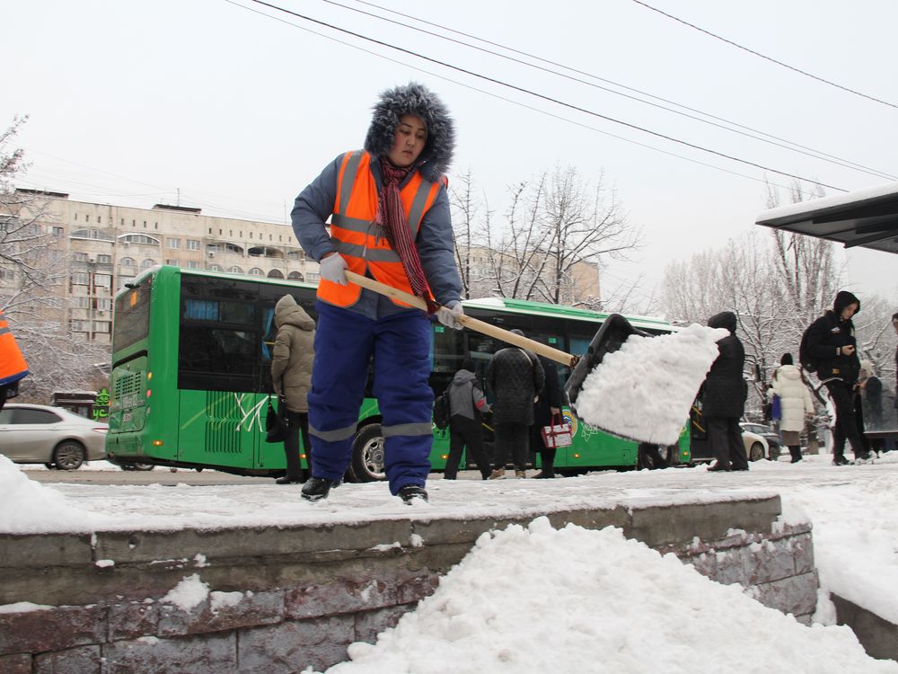 A female street cleaner clears snow after a very heavy snowfall.