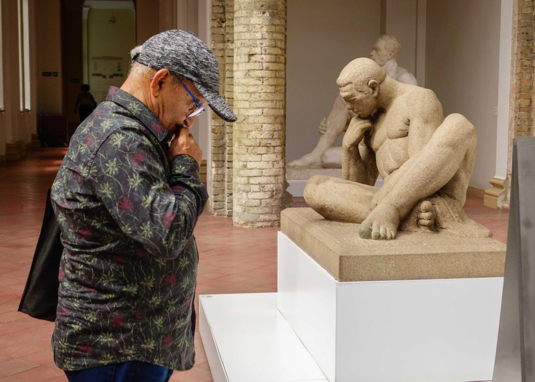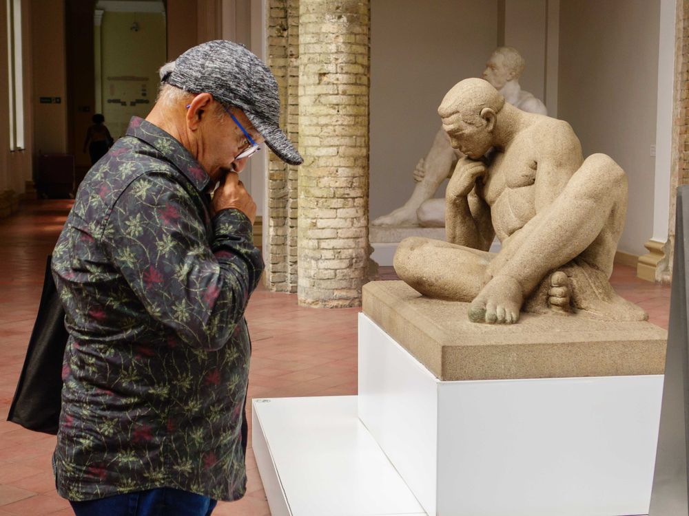 A man in a museum with a pose looks like the statue.