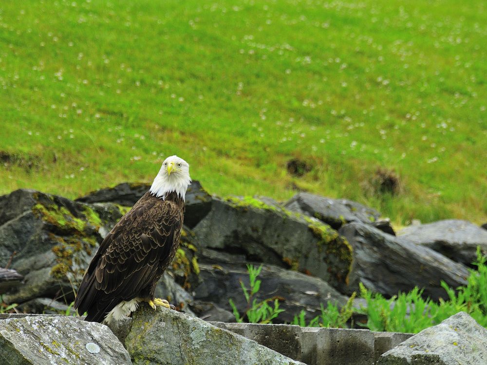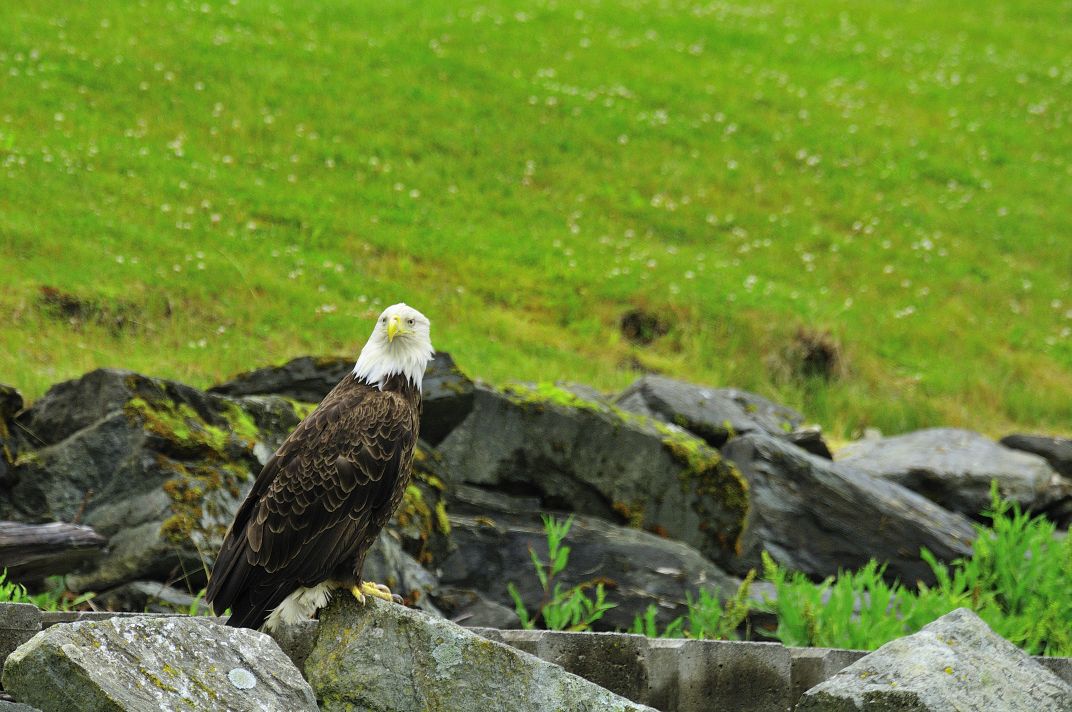 This bald eagle was sitting on a bank where some local fisherman were fishing. They told me that eagles were a nuisance to the local fishermen. I think they are beautiful. Juneau,AK
