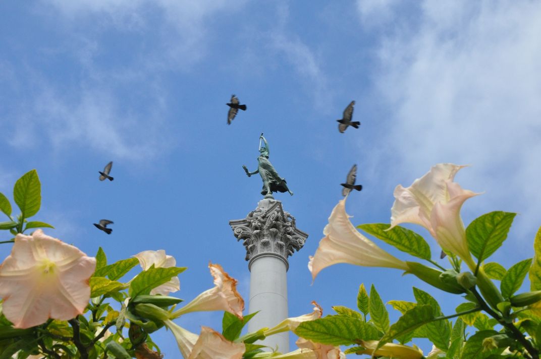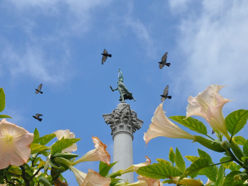 This is the Victory Figurine atop the tall monument located in the middle of Union Square. The photo was framed to shine on the Figurine to tell a story of war victory with assistance from nature (i.e.) the flower beds on the ground. When the photo was