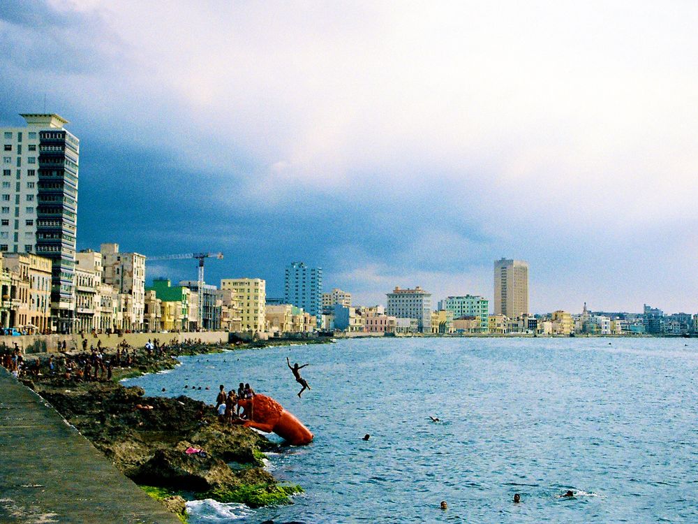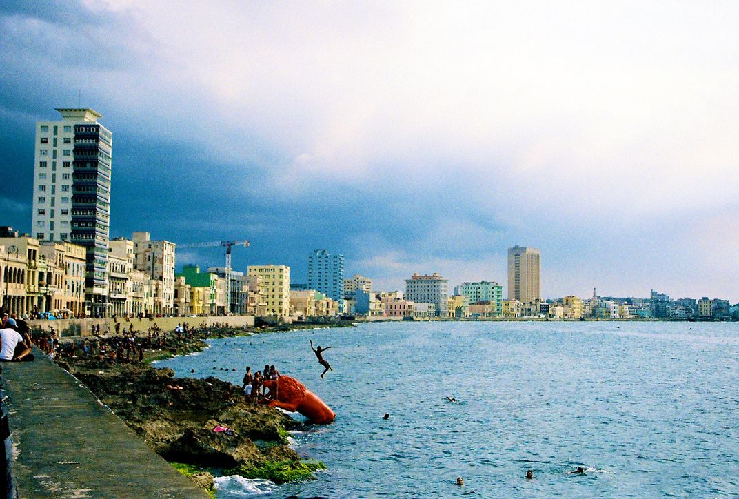 This photo was taken on the Malecn on a very hot Saturday afternoon near Old Havana. Some kids are climbing up on an art installation and using it as launch pad into the water, while droves of other s