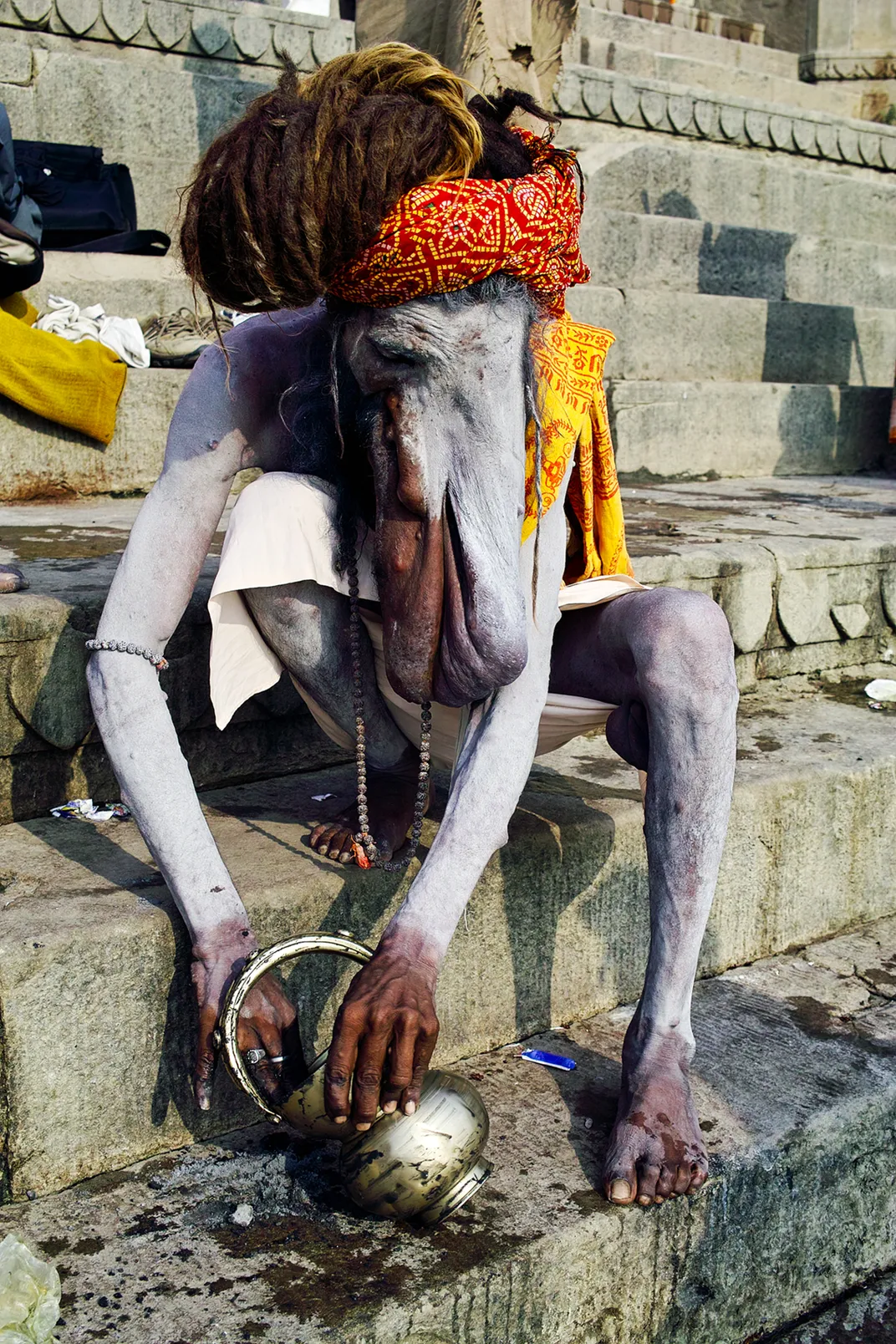 This sadhu(hindu holy man), named Ganesh, was washing his holy water pot in the Ganges. He is from Haridwar(an important pilgrimage city) and he came to Varanasi for meeting his guru(teacher). As his name, he looks like Hindu God Ganesh.