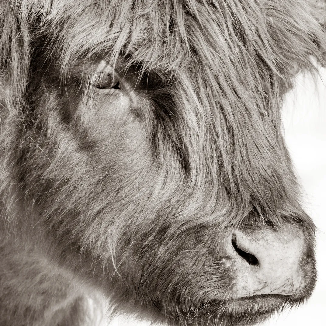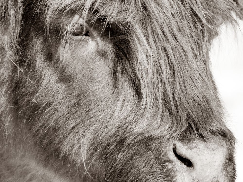 An extremely close, sepia-toned portrait focusing on the detailed texture of a Highland Cow's face. The tight crop captures the intensity of the eye and the intricate flow of the hair, suggesting a moment of quiet introspection.