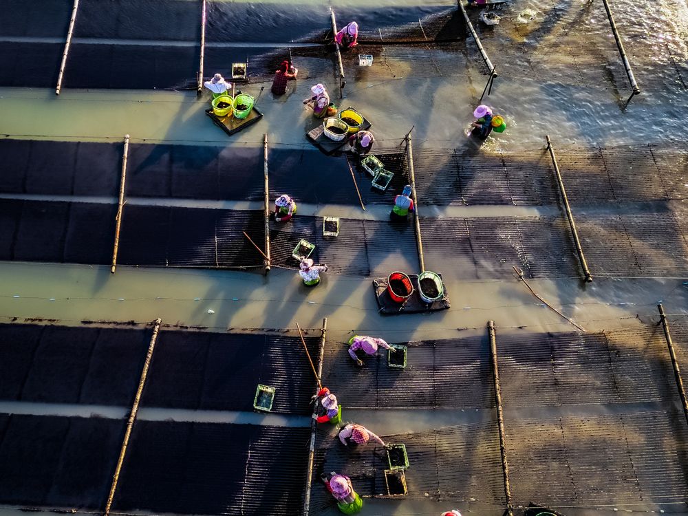 Buckets and basins scatter color across the soft, wet light, and bent-over figures blend seamlessly into the rhythm of labor. The fragments of daily life are laid out like a textured painting infused with moisture, each moment of work carrying the vitality of the water town.