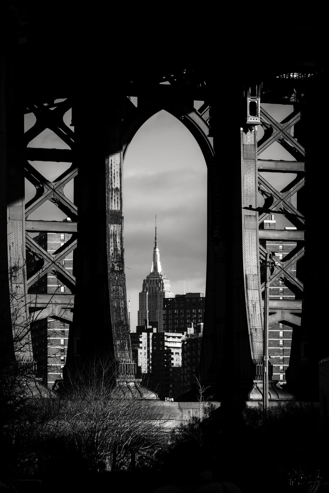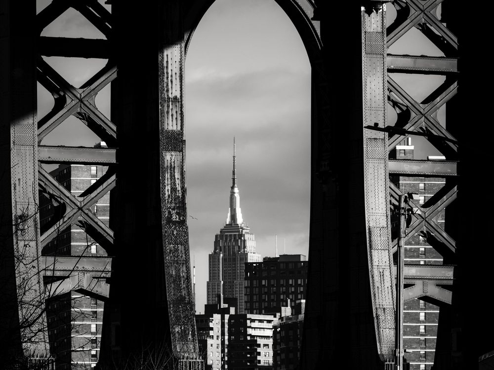 Black and white photo of the Empire State Building as seen through the supports of the Manhattan Bridge