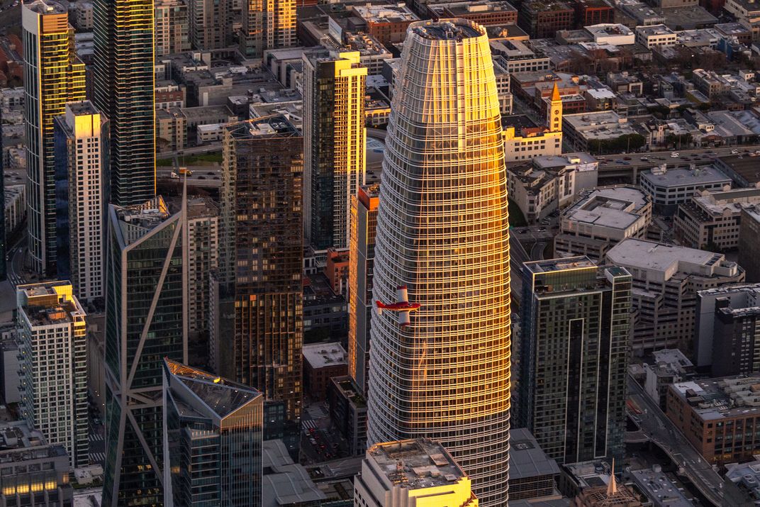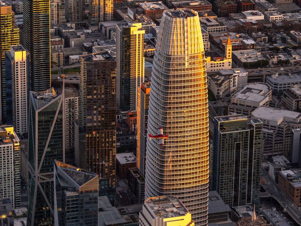 A small red aircraft slips past San Francisco’s Salesforce Tower, its wing catching the same warm light that runs down the city’s gridded streets. From the air, the dense vertical landscape becomes a study in form, scale, and motion — a fleeting intersection of flight and architecture revealed only from above.