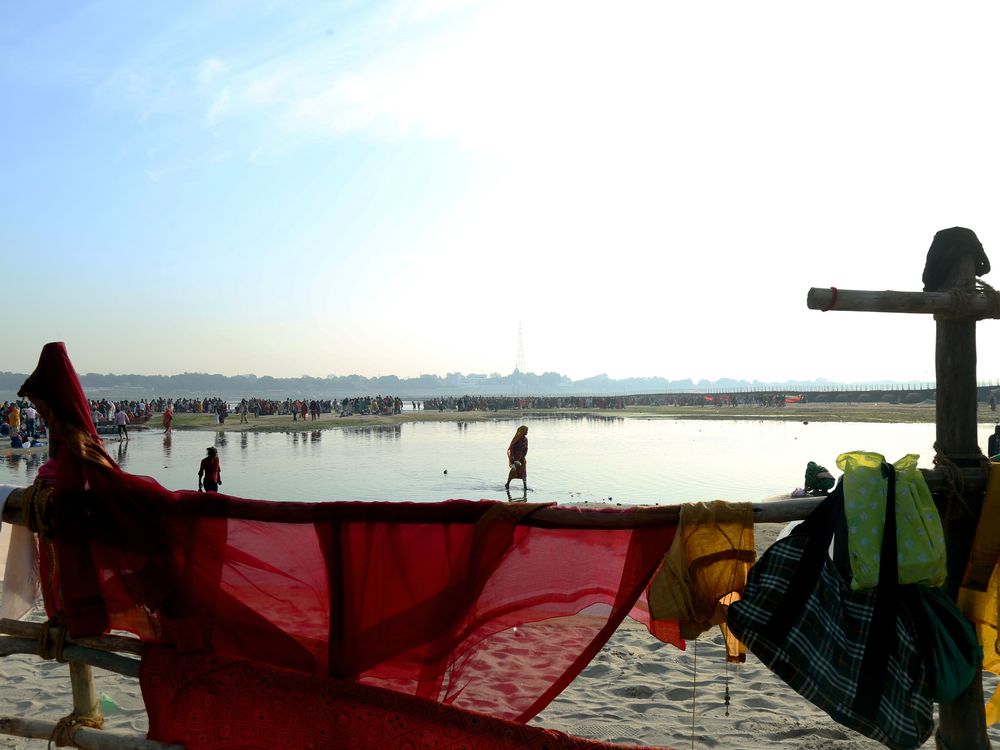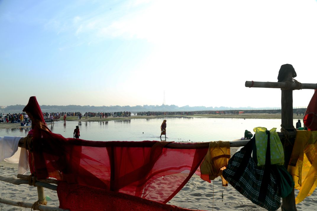 At dawn by the sacred river, vibrant fabrics sway in the wind — a silent testimony to countless prayers offered to the rising sun, where faith and color merge in harmony.