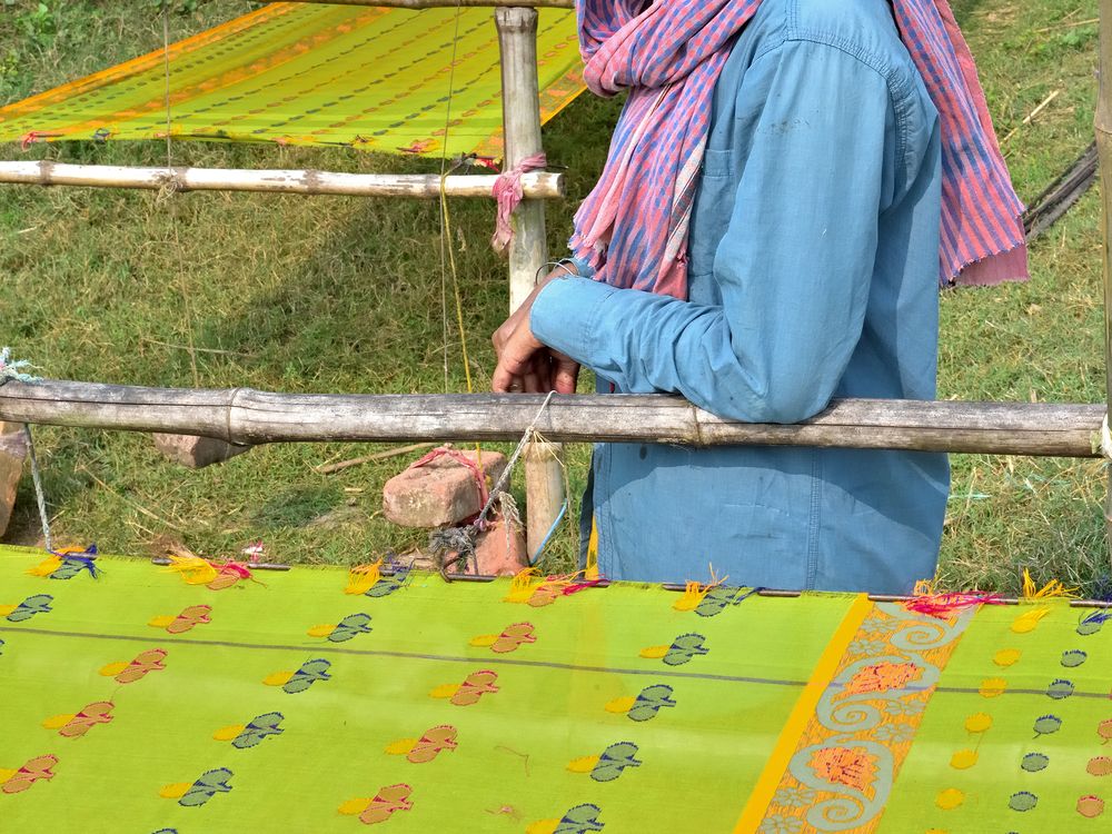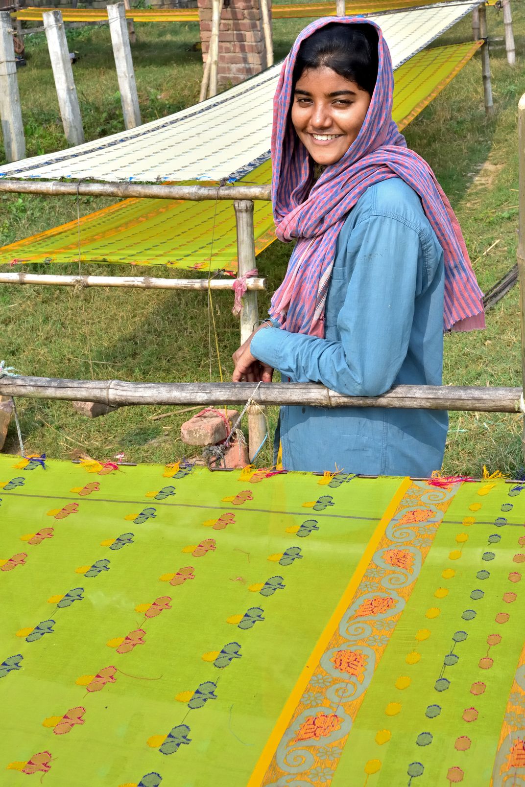 A young girl from a weaver’s family stands among vibrant, freshly dyed Shantipuri sarees, her warm smile reflecting pride and heritage. Surrounded by vivid patterns, she confidently oversees the drying process, embodying the living tradition of Shantipur’s craft.