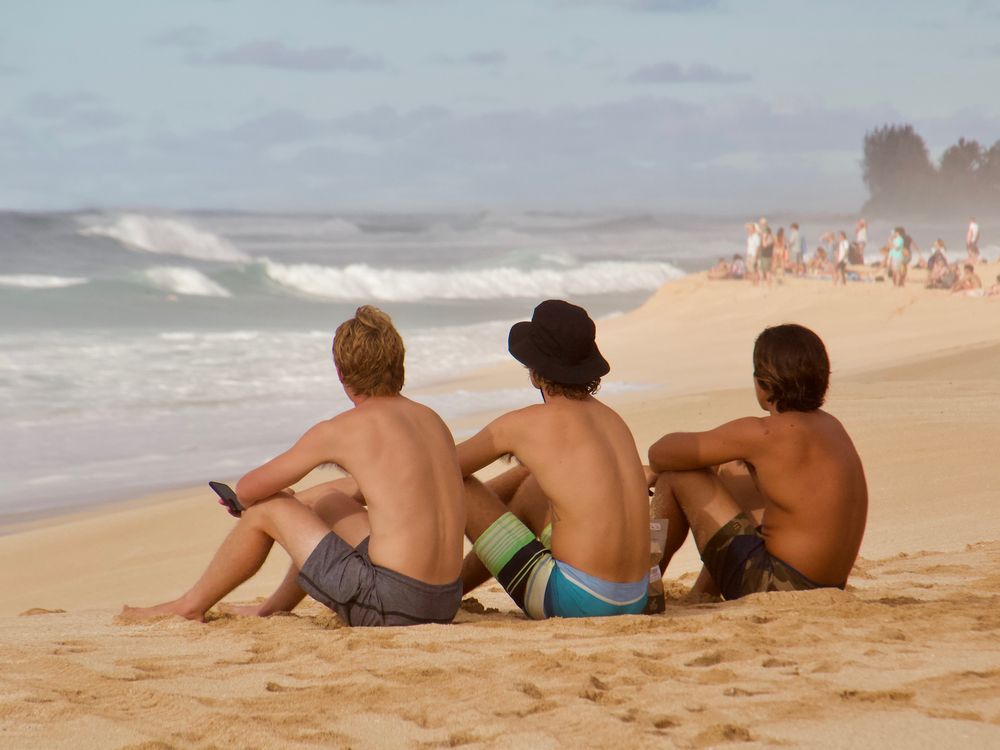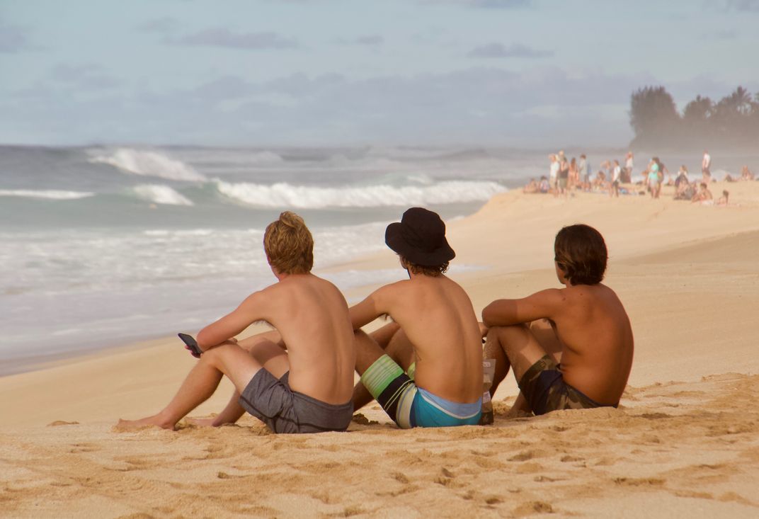 At Bonzai Pipeline on the North Shore of Oahu, Hawaii, spectators sit for hours watching expert surfers ride the waves. These three young men seemed mesmerized by the action.
