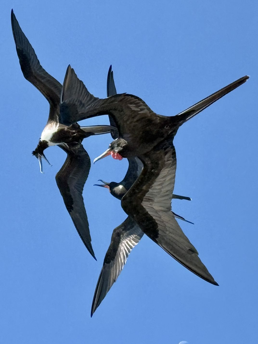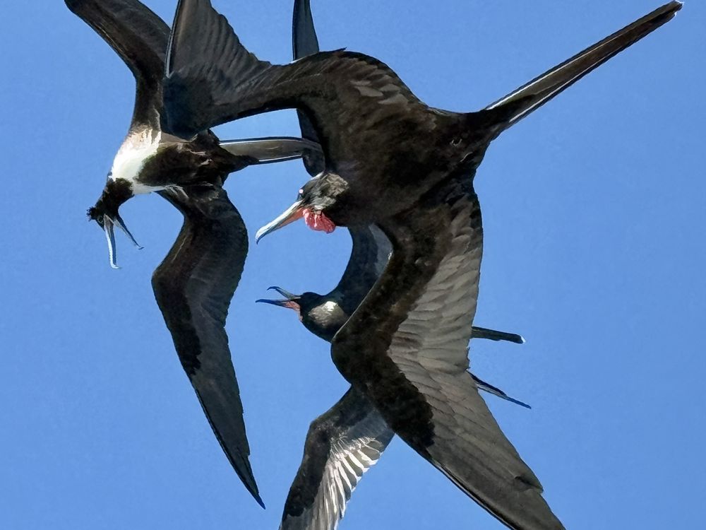 Magnificent Frigatebirds have up to a four-foot wingspan and are constantly in flight hunting for food. The male in this photo is notable for the red sac on its throat, and during mating season, he inflates the sac to attract females.