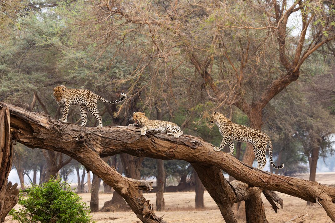 It’s not unusual to see leopards walking (or lounging) on tree limbs; they are adept climbers and spend much off the ground. What is unusual is seeing these solitary animals socializing. A rare trio!