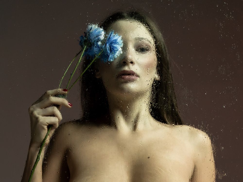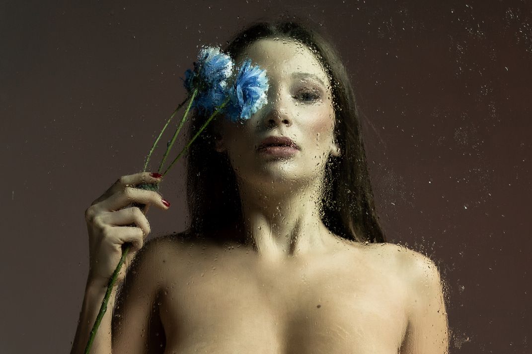 A portrait of vulnerability and defiance — the subject stands behind a rain-streaked glass, her gaze steady, a single flower obscuring her eye. The condensation becomes a veil, softening the line between reality and emotion.