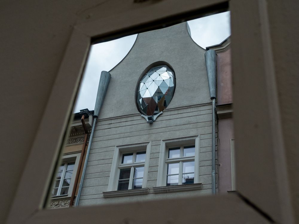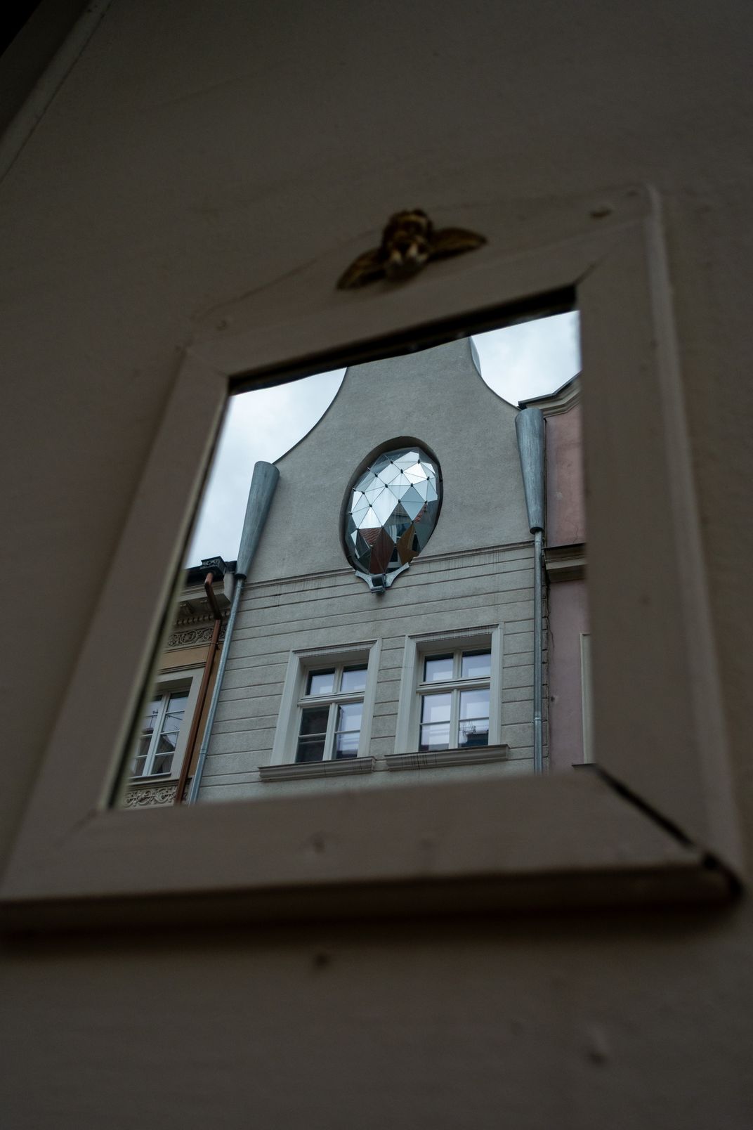 In Poznań, a small wall mirror quietly frames the facade of a neighboring house, where an oval window made of mirrored mosaic catches the gray sky—like a second “looking-glass” world inside the first.