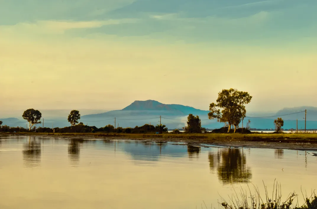 Morning light drifts across Koronisia as the distant mountain dissolves into haze. Reflections soften the horizon, turning the scene into a quiet echo of place — a moment that feels remembered as much as seen.