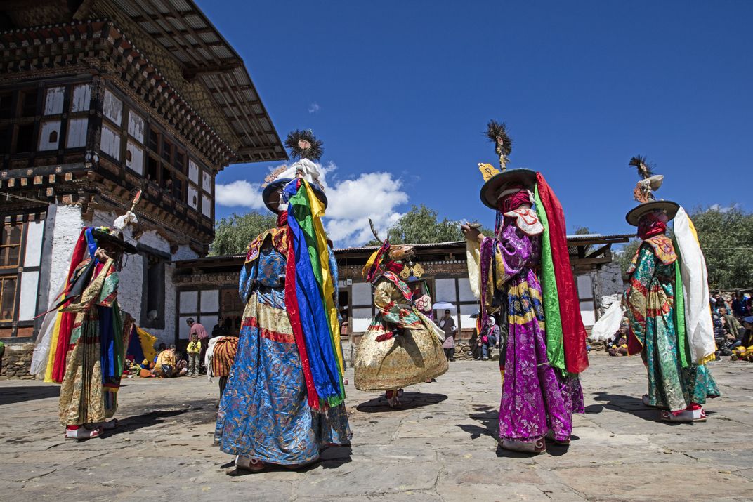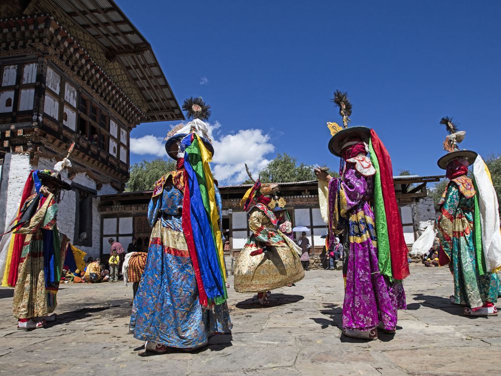 A festival being celebrated in Bumthang, Bhutan where we saw masked dancers performing in a small Temple court yard.