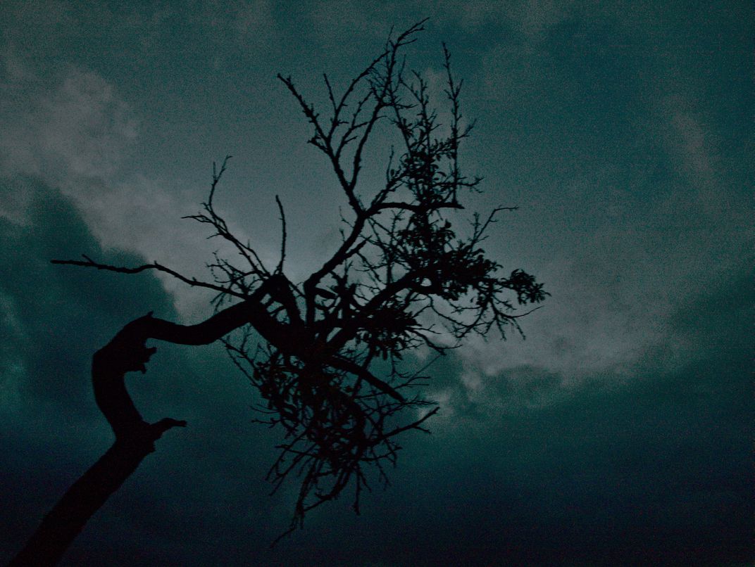 A tree reminiscent of a thunderbolt under the cloudy night sky. It started raining moments after I took this picture.