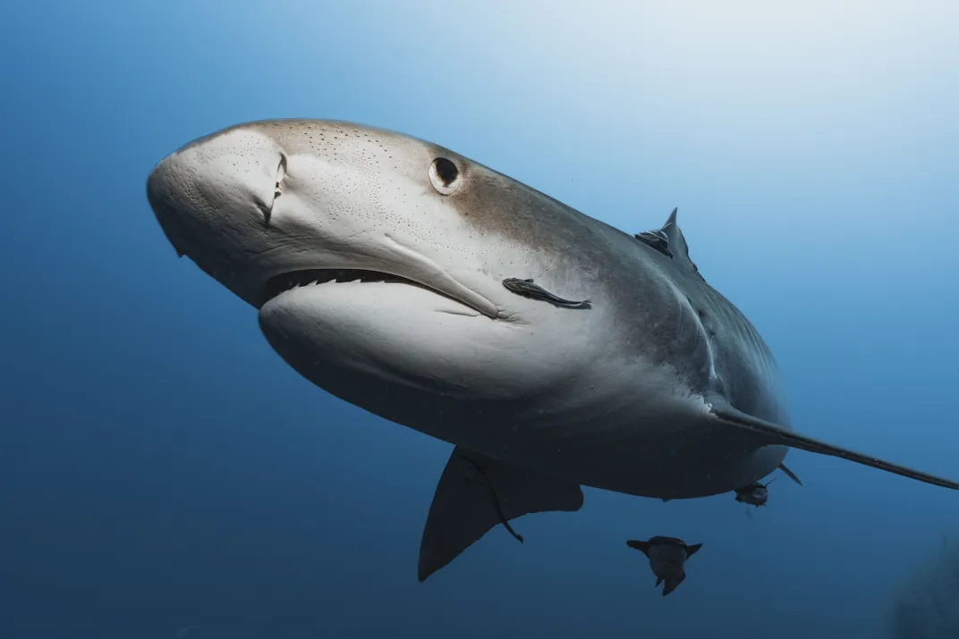 A large tiger shark glides past a wreck off Jupiter, Florida, moving with calm precision despite its immense power. The close encounter reveals the species’ striking presence, often misunderstood, yet undeniably majestic.