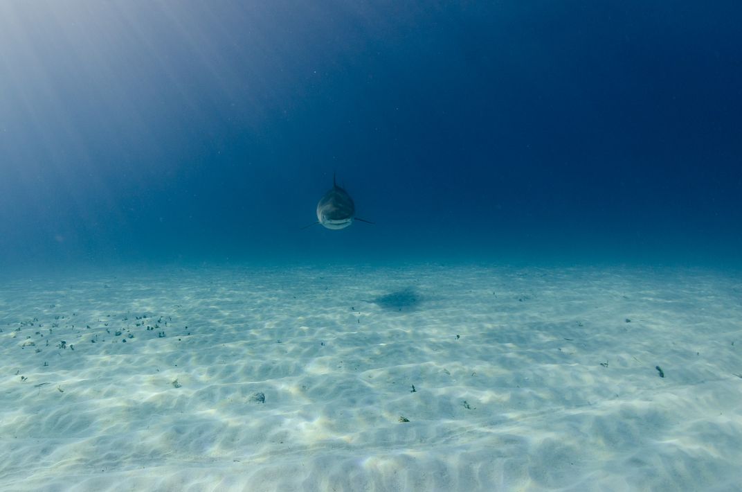 Tiger beach is a popular dive spot where tiger sharks and other shark species congregate. When there are many divers, guides use fish heads as bait, but usually everybody runs out of air within the first 45-60 minutes. I had plenty of air to spare, so I stayed by myself for another half hour. By then, most sharks had lost interest, but one kept coming back to check me out. There was no bait, just curiosity on both sides.