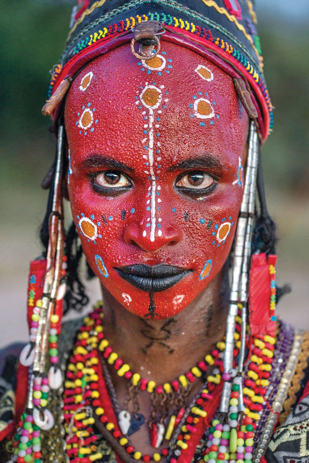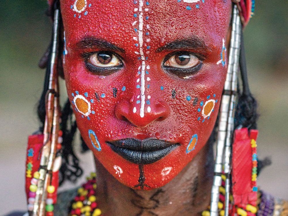 Portrait of a Sudosukai - Wodaabe tribesman during the celebration of the Gerewol festival (Chad). The Gerewol is an annual courtship ritual competition mainly among the nomad people of Niger and Chad. This is a beauty pageant for the young men so that they might be selected by the girls of the tribe. Young men dressed in elaborate ornamentation and made up in traditional face painting gather in lines to dance and sing, vying for the attentions of marriageable young women. The Gerewol occurs each year as the traditionally nomadic Wodaabe cattle herders gather at the southern edge of the Sahara before dispersing south on their dry season pastures.