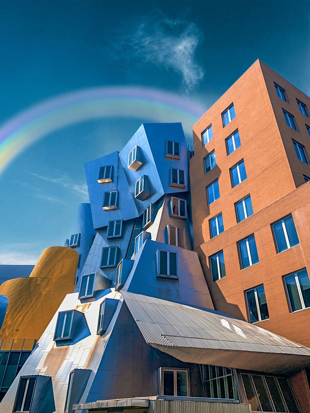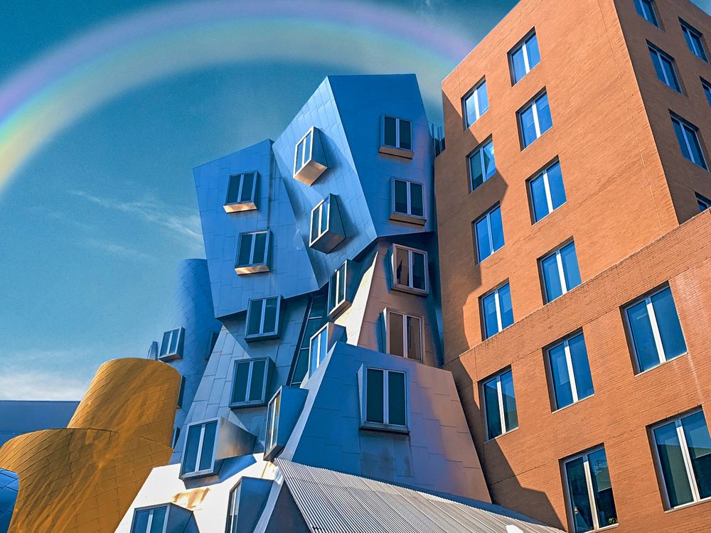 Featuring leaning towers, angled walls, and cartoonish shapes, this image depicts MIT's Stata Center. Within its walls, innovative work in the fields of computer science, artificial intelligence, and communications is conducted.