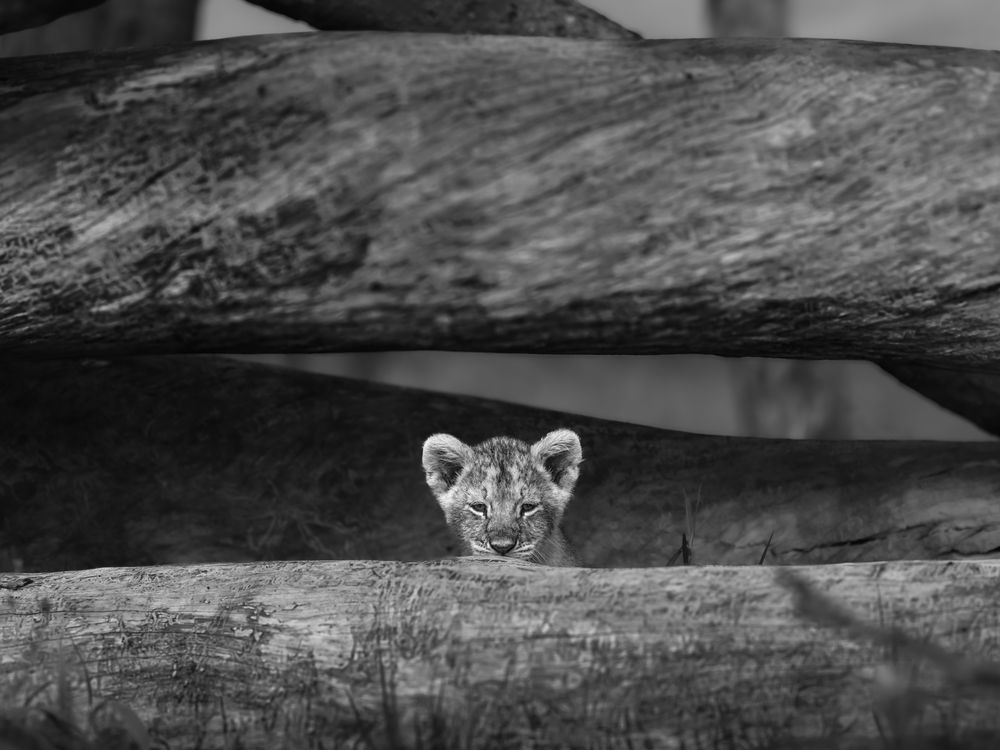 A lion cub exudes curiosity as it peeks over a fallen tree trunk, its eyes wide with wonder.