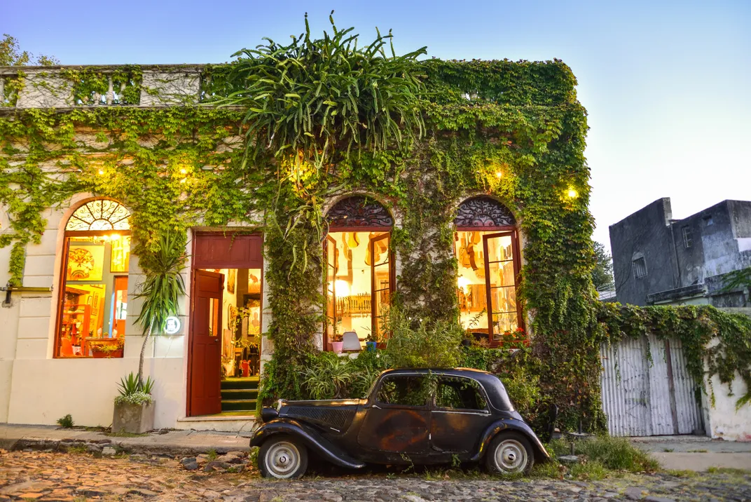 An old timer is parked on a cobble stone street outside a historic building in Colonia del Sacramento, Uruguay. The entire town is like a time bubble where history is alive and well.