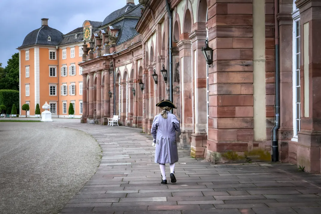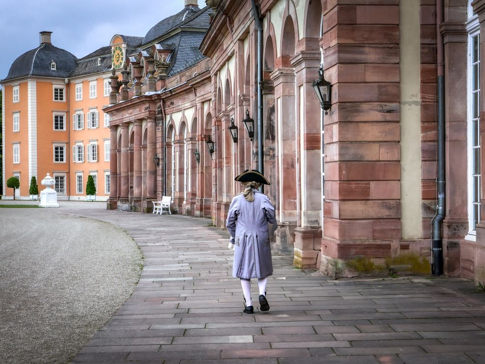 The scene was shot at Schwetzingen Castle in Germany. The gentleman in the picture belongs to the museum and is wearing typical 18th-century clothing in Germany.