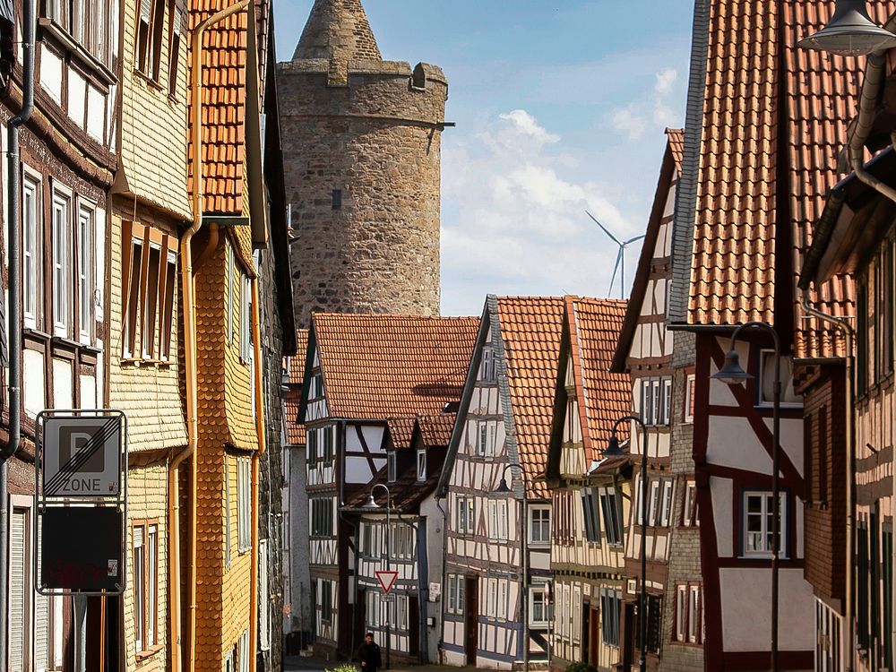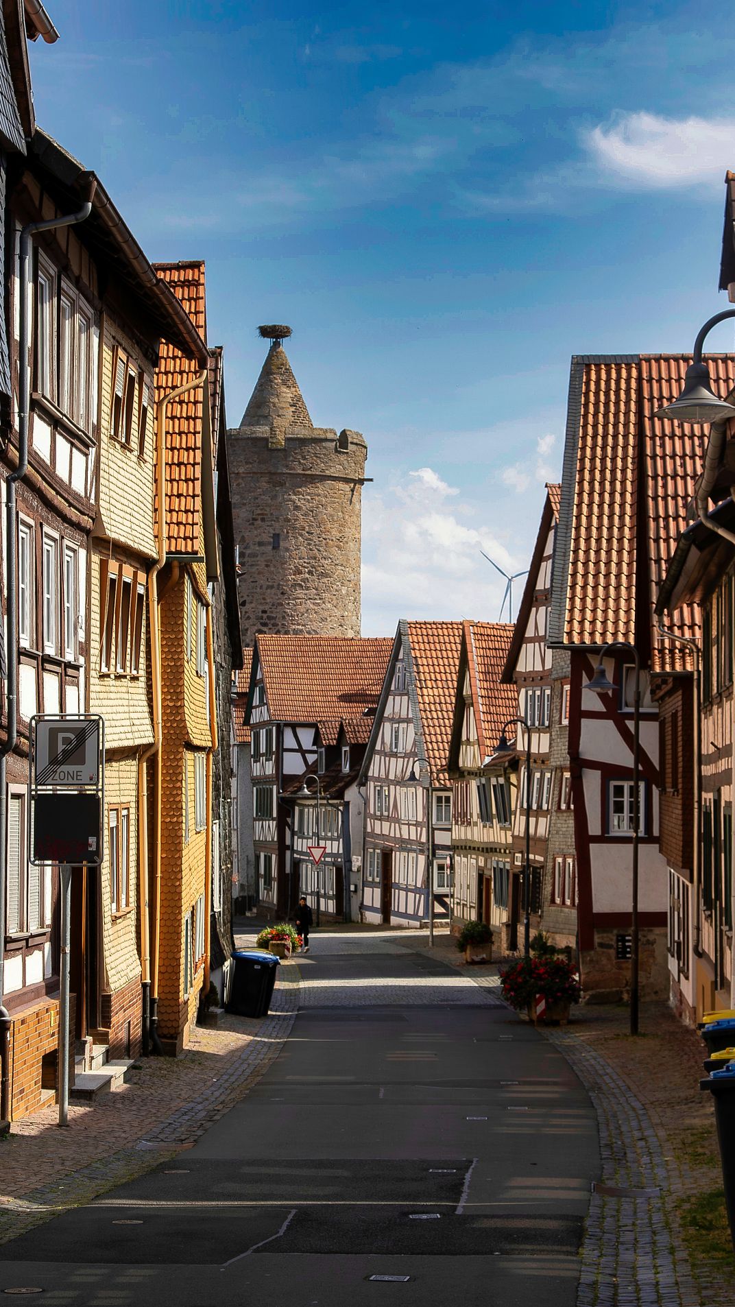 A quiet street in Alsfeld, Germany, lined with centuries-old half-timbered houses leading toward a medieval tower — a perfect glimpse into Germany’s architectural heritage.