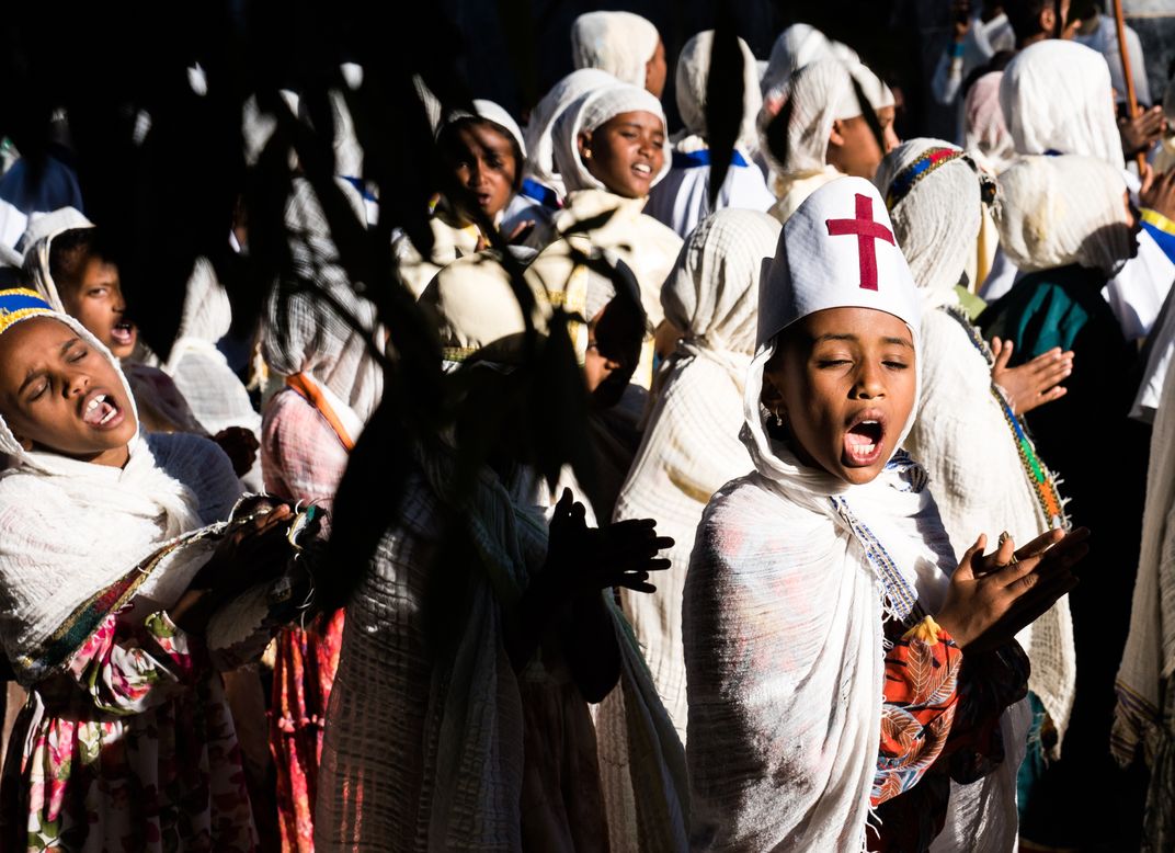 Children chanting at Timkat (Epiphany) religious celebrations in Aksum, Ethiopia
