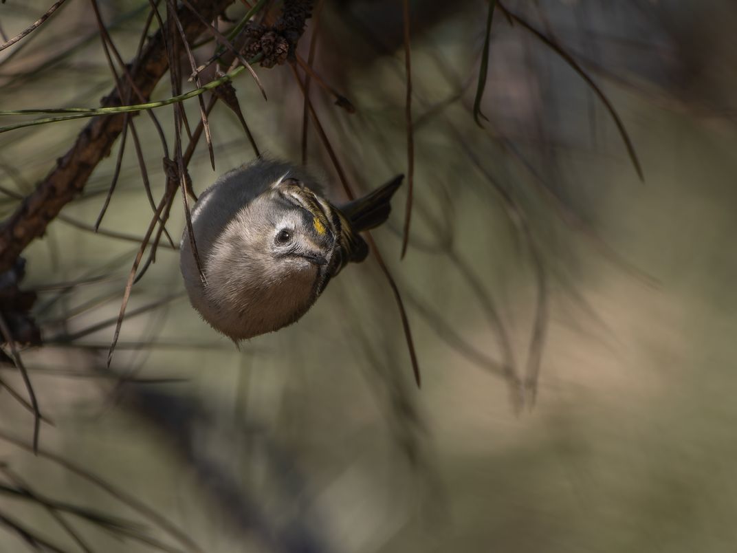 Mastering the art of balance, a goldcrest uses its slender feet to grip a cluster of pine needles.