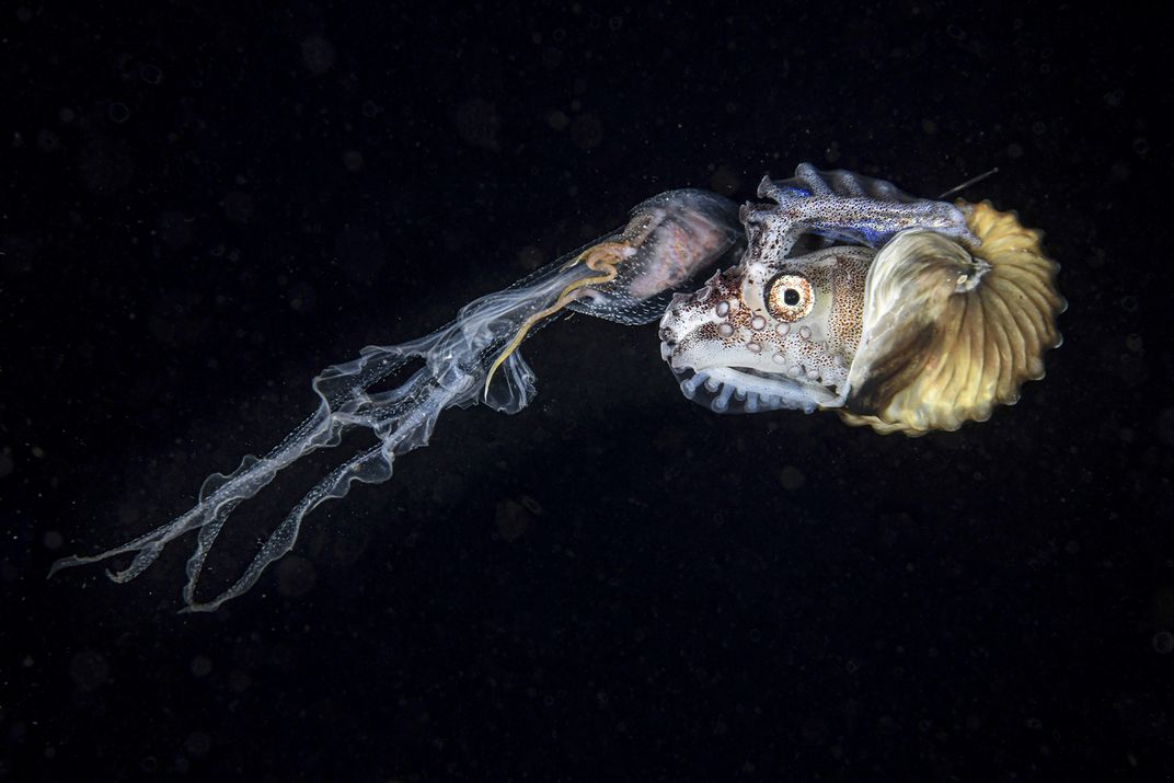 Paper Nautilus LESSER ARGONAUT Argonaut hians The Argonauts are a truly pelagic octopus that spend their entire life at sea. tema Piemor They are found circumglobaly and in almost every ocean with the exception of the polar regions. Nicknamed "Nautilus" for the shape of their shell, they are definitely not a Nautilus. The shell is created exclusively by the female to brood her eggs. Using their 3rd and 7th arm, the female forms the shell with a calcite compound unlike any other shell formed in nature. The shell doesn't contain compartments or chambers (like a true Nautilus) to assist with buoyancy, so the female traps air in her shell at the surface by "Looping over." This trapped air assists them in maintaining a shallow position in the water column and closer to their food source of crustaceans and more importantly for meeting a mate. The male argonaut looks similar to amid-water octopus although very small. The second highest degree of sexual dimorphism in nature occurs with Argonauts with the male no larger than 20-30 mm, being the largest we've ever encountered. Most are as small as a garden pea. The Female can get quite large measuring in at 150 mm. for the male. From there the fernale does the rest of the work, fertilizing her eggs one at a time while she lays them into her protective shell. The shell is remarkable. It is hard, and often times the female will run into our camera housings, our heads and sometimes our lights. The contact makes a hard clicking thud before they spin off clumsily and begin jetting again. However, the discarded shell, when found on the substrate are extremely delicate and crumble to the touch. It is also common to see Argonauts using flotsam of all variety to assist them in remaining in the Male Argonauta hians among a Siphonophore Mating: Like other octopus, the male uses his modified 7th arm, called the hectocotylus, to transfer the sperm to the female. The male touches the female, the arm breaks off, and the act is complete Male Argonauta hians on the top of a drifting Jellyfish Male Argonauta hians on the top of a drifting Salp