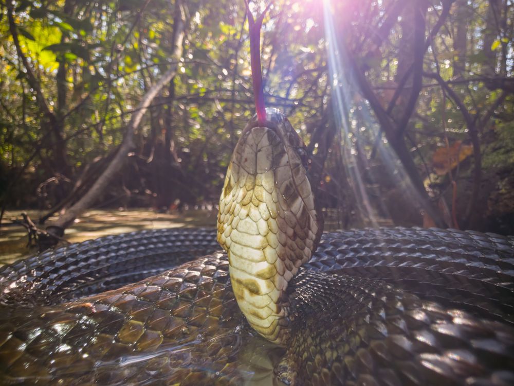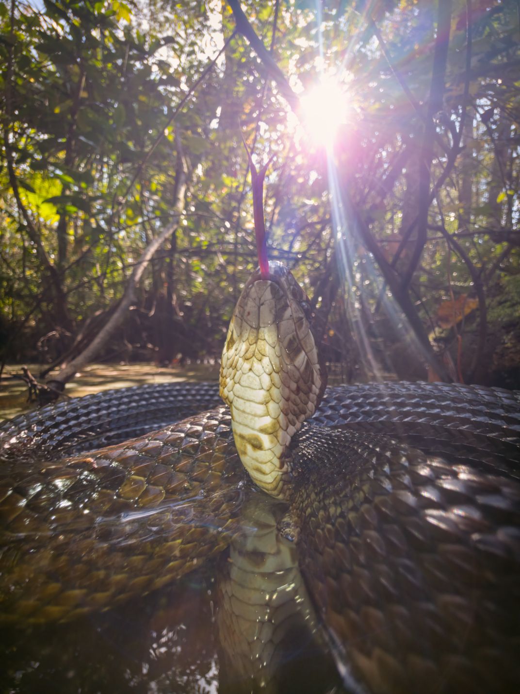 Photographed at absolute water level with a mobile phone using an ultra-wide lens. A wild cottonmouth flicks its tongue into the sun, forming a rare triple-tongue effect: the real tongue, its shadow, and its reflection.