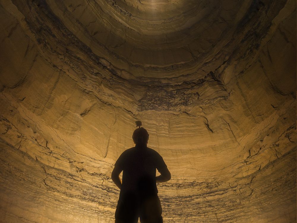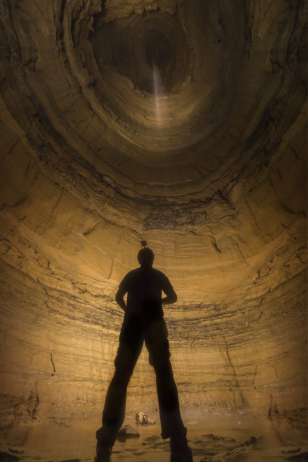 After hiking a mile underground over rocks and through tight passages, I made it to Topless Dome, the 400' underground waterfall.