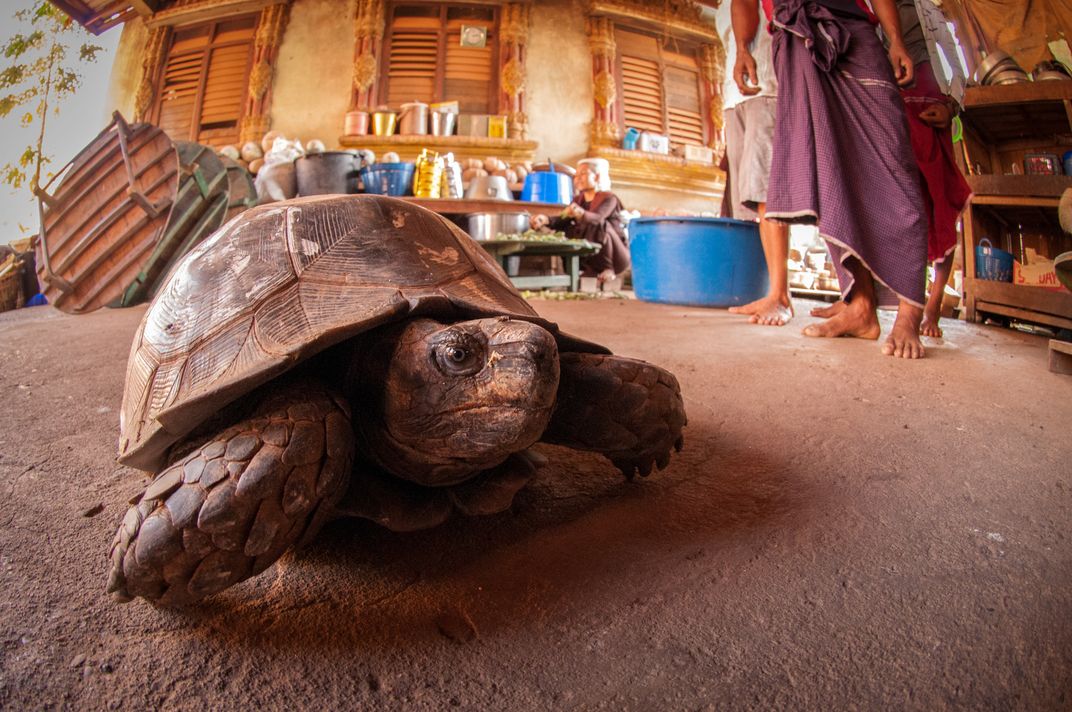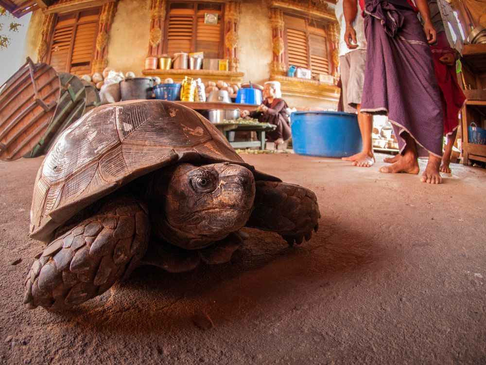This tortoise was one of many animals (both wild and domestic) dropped off at a temple in southern Myanmar. Due to the Buddhist beliefs, many local people view temples and monasteries as a safe haven for orphaned or injured wildlife.