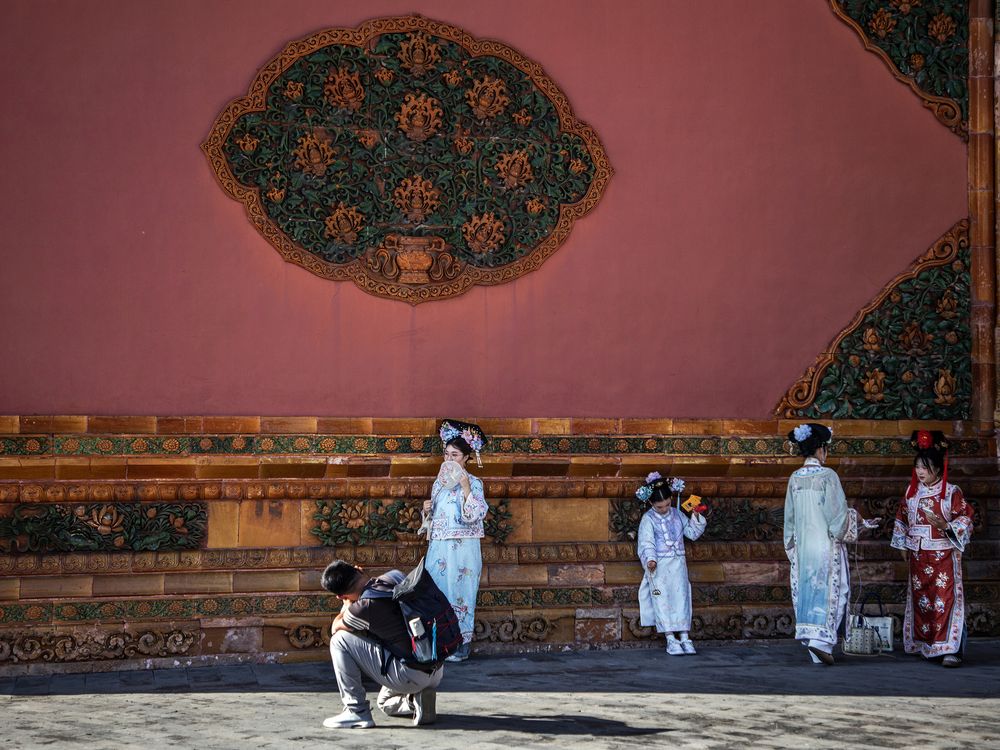 Tourists dressed in Qing Dynasty costumes are taking photos inside the Forbidden City in Beijing, a world cultural heritage site.