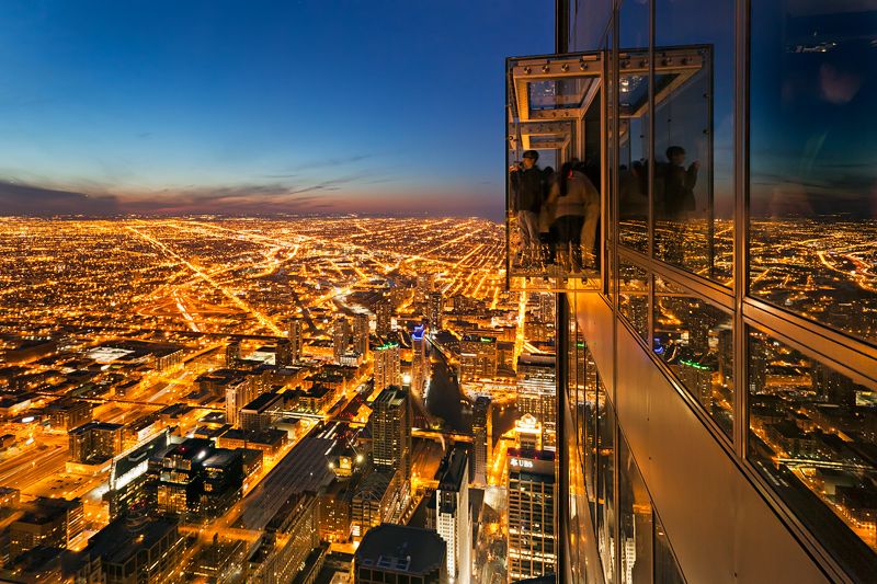 Tourists stepped on the glass "skydeck" of top of the Willis Tower, the highest building in US.