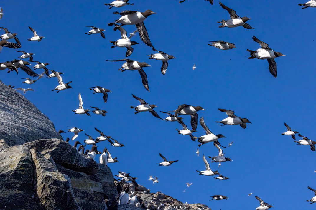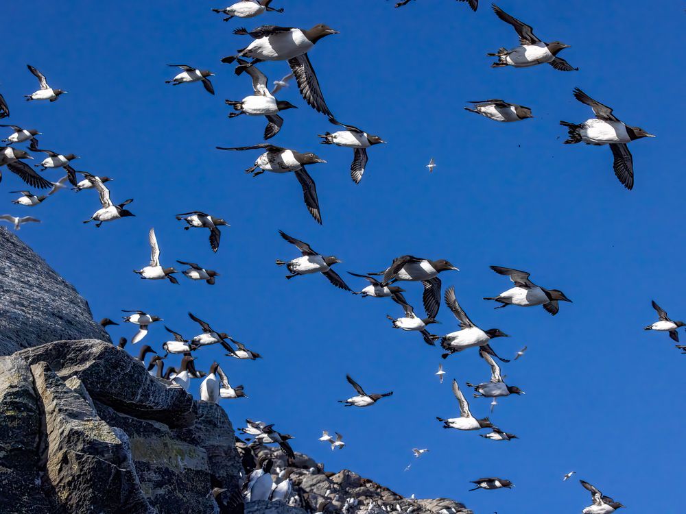 This photo is from Hornöy bird island, Vardö, Norway. More than half a million birds nest on the island. Sometimes thousands of birds leave the island simultaneously and go to get feeding from the sea, like Atlantic Murres in this photo.