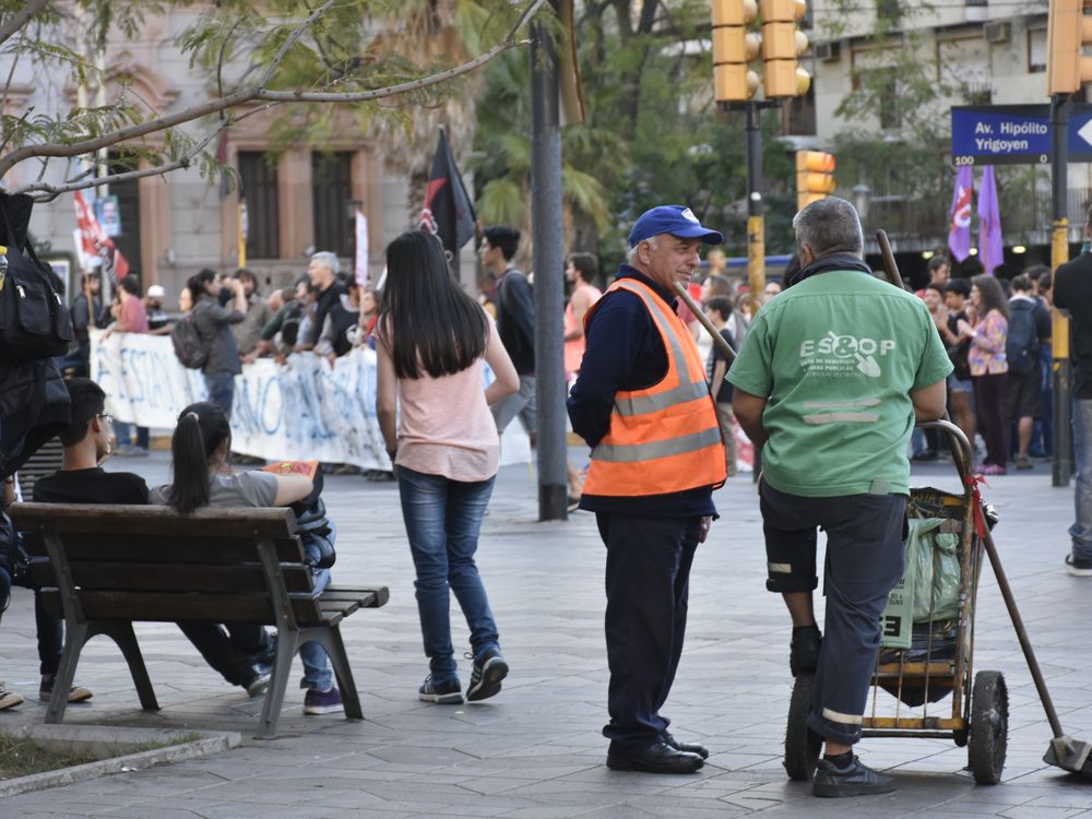 Un barrendero y un cuidador de coches conversan en la Calle al paso de una manifestación popular en mi ciudad.