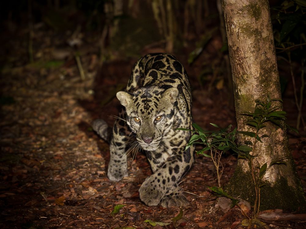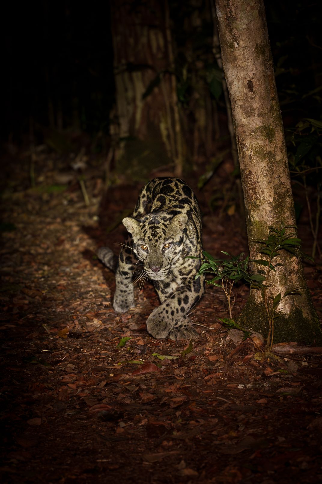 Deep in Borneo's Tanjung Puting National Park, a rare Sunda Clouded Leopard (Neofelis diardi) emerges from the dark. Usually seen only via camera traps, this elusive predator appeared just 10m away during a night trek, staring us down before stalking our group.