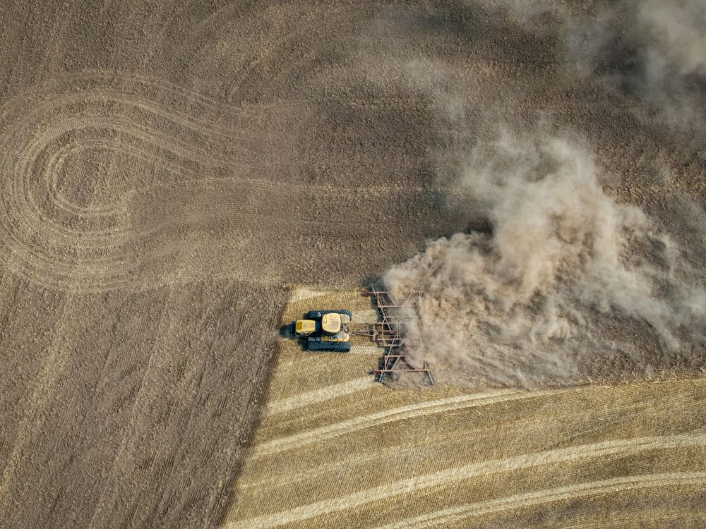 A farm tractor is working on a farmland, its trace creates a interesting illustration.