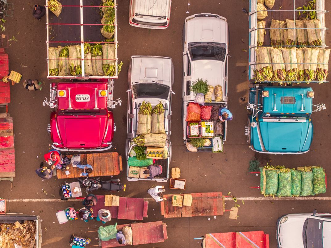 Vendors at Bogotá’s Corabastos market load and unload produce in the early morning, moving sacks of plantains, tubers and vegetables between trucks, carts and waiting buyers. Seen from above, their work becomes a patterned choreography of labor and exchange — a glimpse into the human engine that sustains one of Latin America’s largest food markets. In this moment, a few traders pause for a well-deserved coffee break amid the rush.