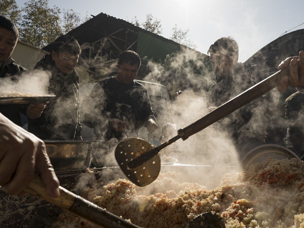 Ethnic Dungan man prepares plov to service at a wedding ceremony outside of Bishkek, Kyrgyzstan, Sunday, Oct. 27, 2019.