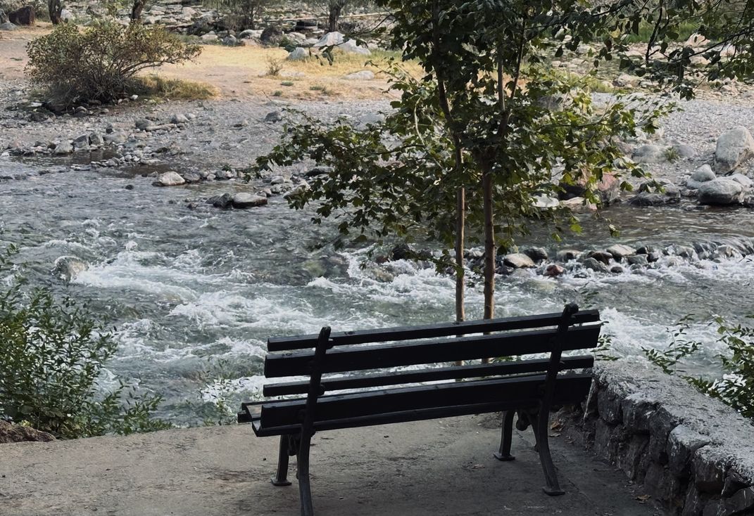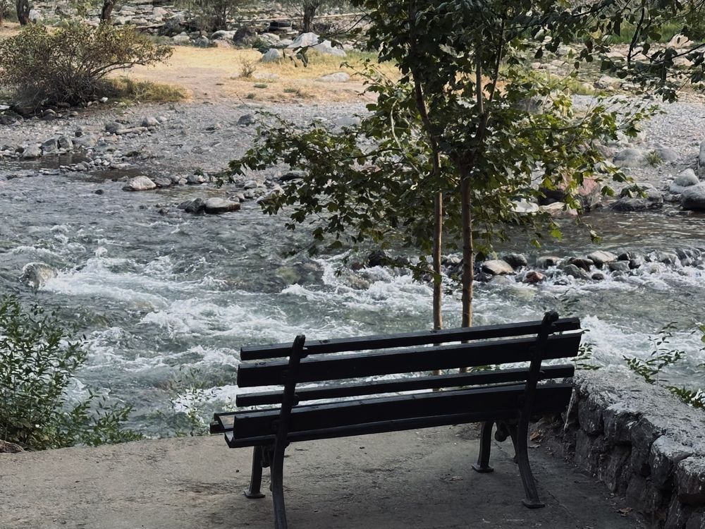 Nature's symphony, front row seat. This quiet bench by the rushing river invites you to pause, breathe, and soak in the serene beauty of the moment.