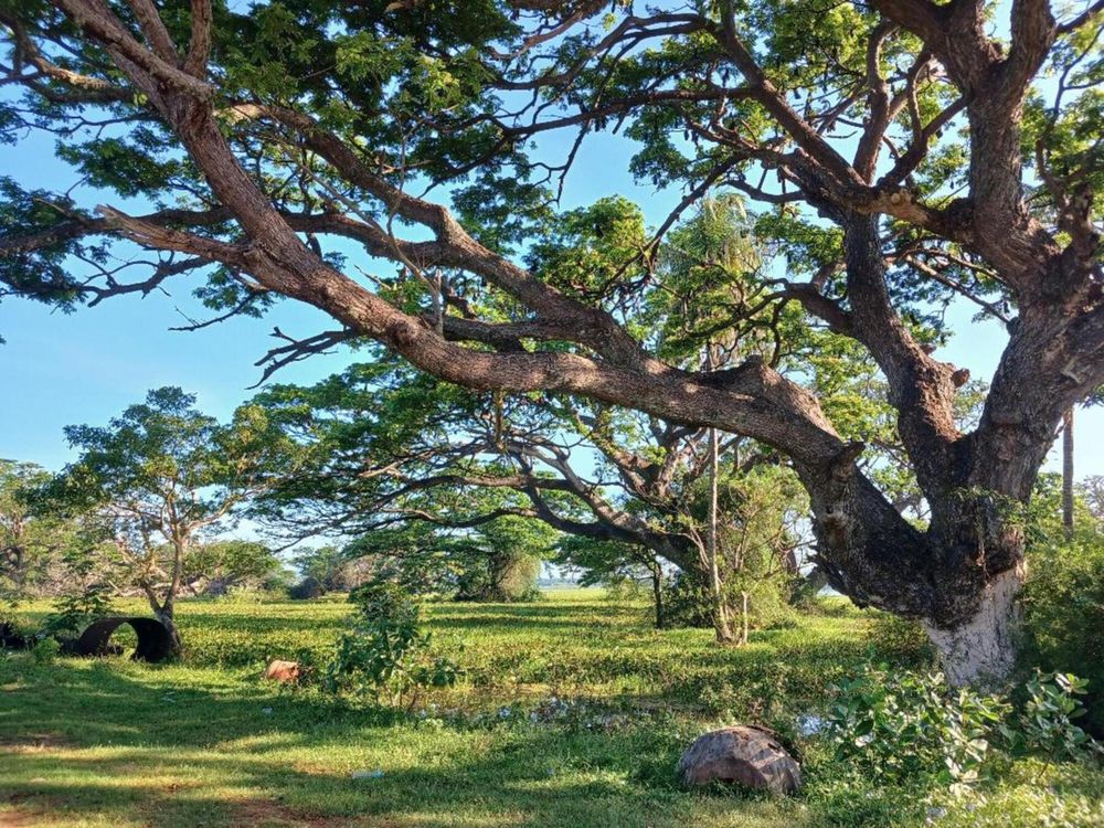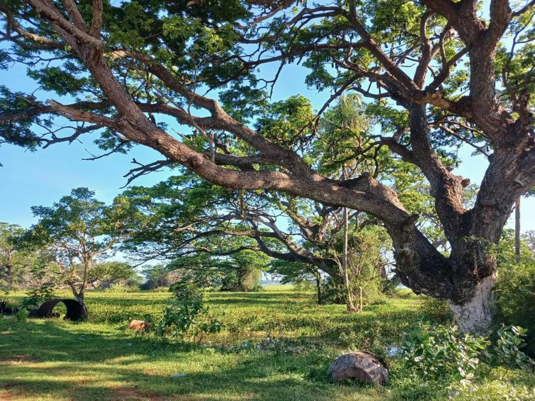 This photo shows a scene of calm nature, with a bright blue sky, luscious greenery and a large, well-branched tree in the foreground.