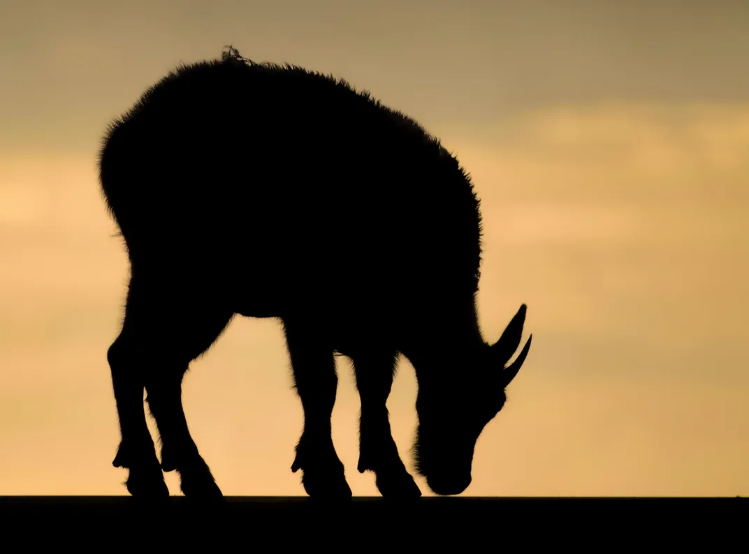 A mountain goat searches for minerals atop of Mount Blue Sky in Colorado. As the sun begins to rise, a golden hue is cast across the sky creating a sense of tranquility.
